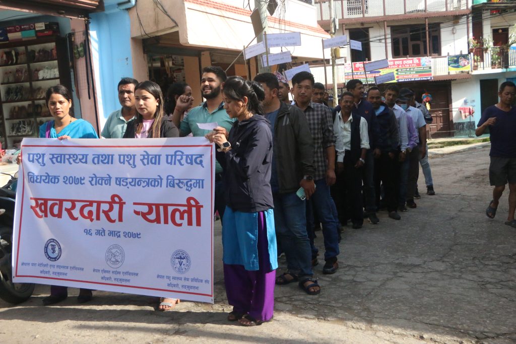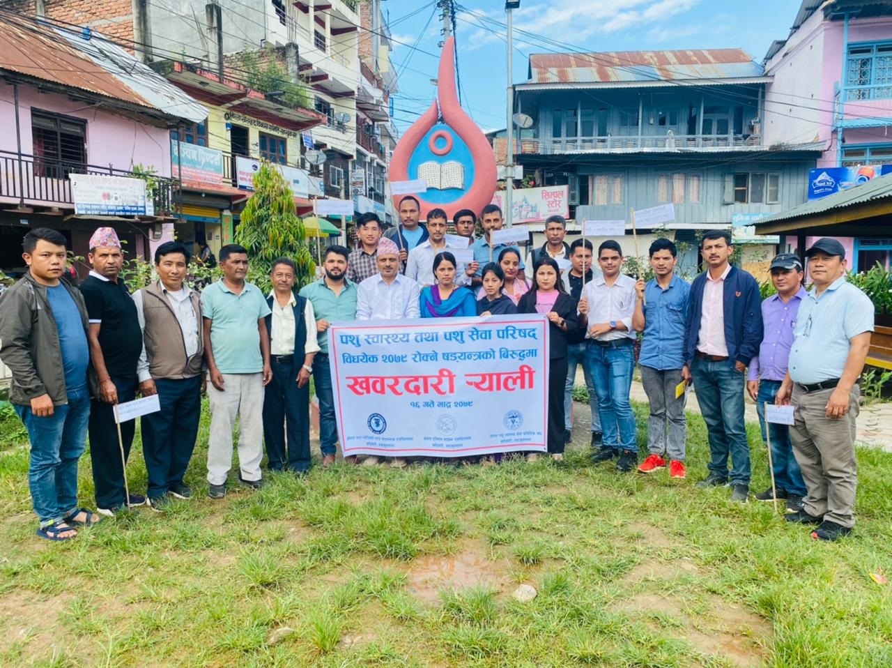 पशू स्वास्थ्य तथा पशु सेवा परिषद विद्ययेक २०७९ रोक्ने षड्यन्त्रका विरुद्धमा खबरदारी सहितको विरोध ¥याली प्रदर्शन गरिएको भेटेरीनरी अस्पताल तथा पशु सेवा विज्ञ केन्द्र संखुवासभाका प्रमुख हिमालय पोख्रेलले बताउनु भयो ।