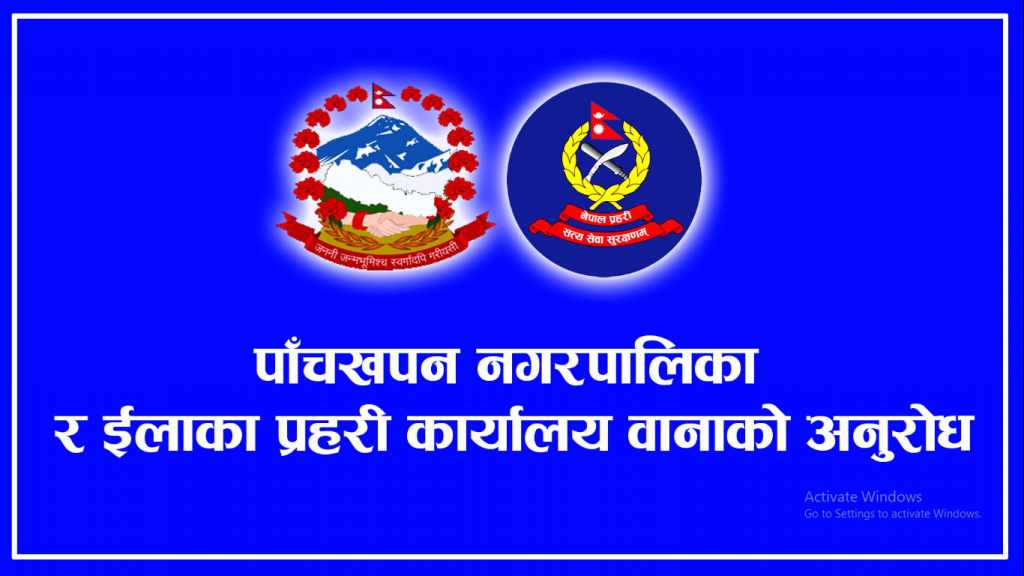 - कुनै प्रकारको घट्ना भएमा प्रहरी कन्ट्रोलको फोन १०० जानकारी गरौँ गराओैँ ।