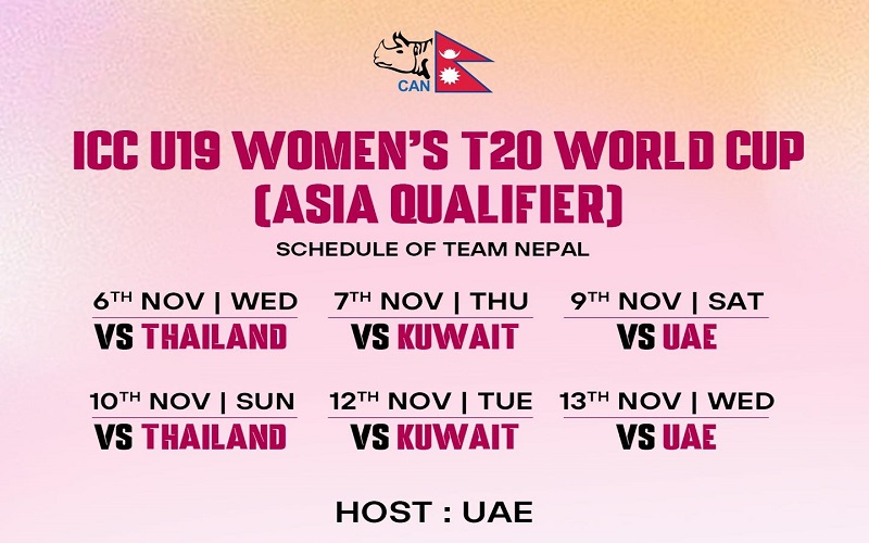 नेपाल क्रिकेट सङ्घ (क्यान) ले हिजो सार्वजनिक गरेको विश्वकप एशिया छनोटको खेल तालिका अनुसार नेपालको पहिलो खेल कात्तिक २१ गते थाईल्यान्डसँग, २२ गते कुवेतसँग, २४ गते घरेलु टोली यूएईसँग, २५ गते थाइल्यान्डसँग, २७ गते कुवेतसँग र अन्तिम खेलमा कार्तिक २८ गते यूएईसँग खेल्ने छ ।