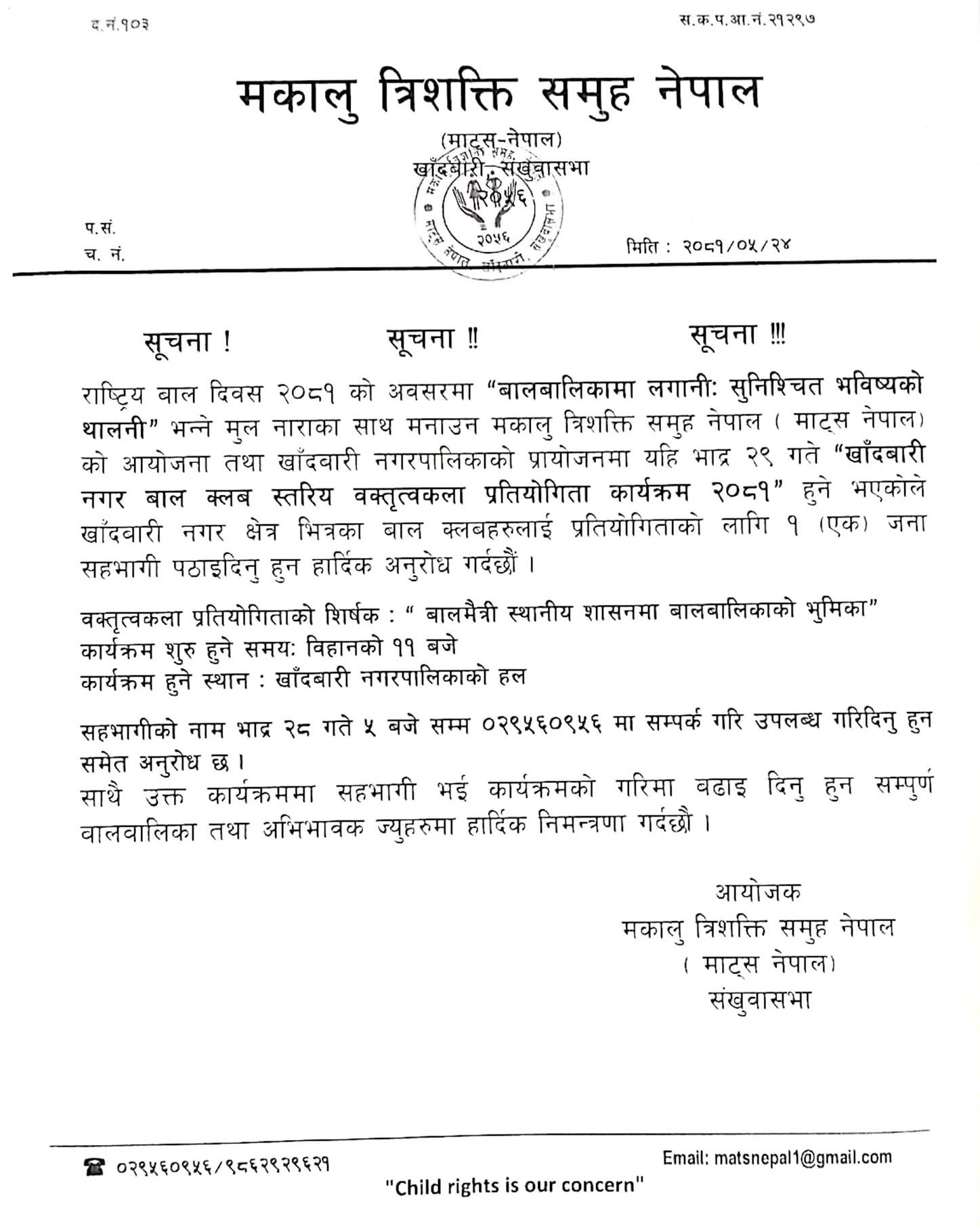 खाँदबारी । संखुवासभाको खाँदबारीमा बाल दिवसको अवसरमा नगर स्तरीय बाल क्लब वक्तृत्वकला प्रतियोगिता हुने भएको छ । मकालु त्रिशक्ति समूह (माट्स नेपाल) को आयोजनामा खाँदबारी नगरपालिका भित्रका बाल क्लवहरुबिच प्रतियोगिता गराउन लागिएको माट्स नेपालका कार्यालय सचिव सुजन अधिकारीले बताउनु भयो ।