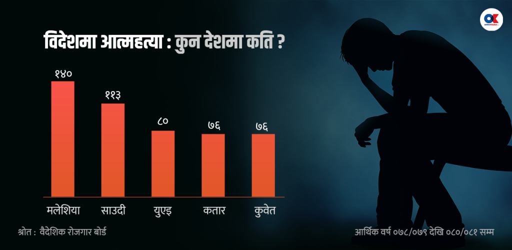वैदेशिक रोजगारीमा गएर आत्महत्या गर्नेमा सबैभन्दा धेरै मलेसियामा छन् । त्यसपछि खाडी मुलुकमा छन् । पछिल्लो तीन वर्षमा मलेसियामा मात्र १४० जना श्रमिकले आत्महत्या गरेका छन् । त्यस्तै दोस्रोमा साउदी छ । साउदीमा ११३ जनाले आत्महत्या गरेका छन् ।