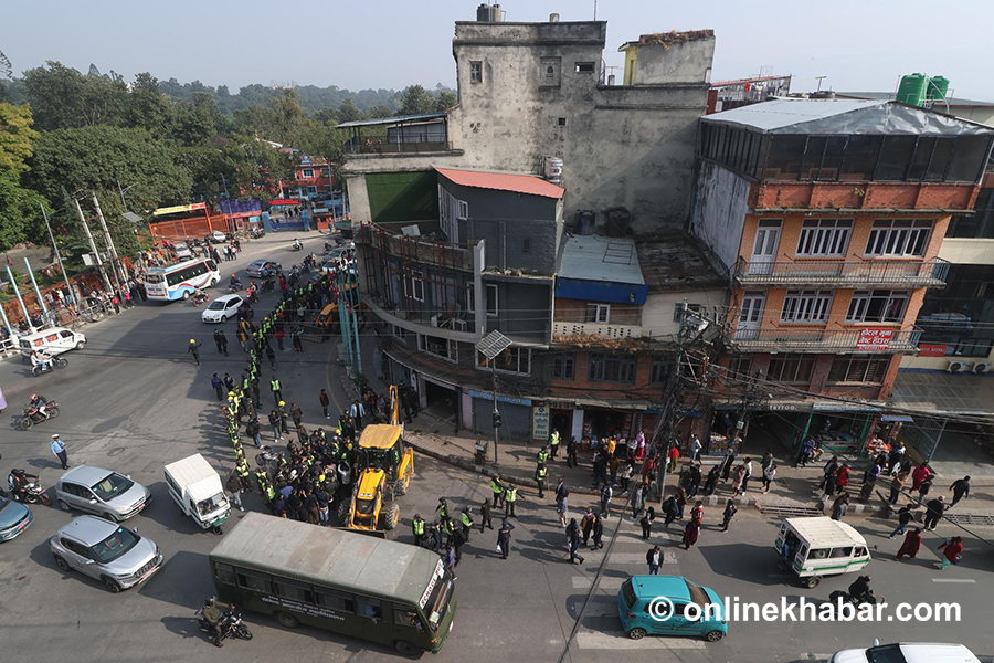 चक्रपथ सडक सीमा २५ मिटरभित्र बनाइएका पक्की, कच्ची संरचना हटाउन डोजर चलाइएको नगर प्रहरी उपरीक्षक दिनेश अर्यालले जानकारी दिए ।