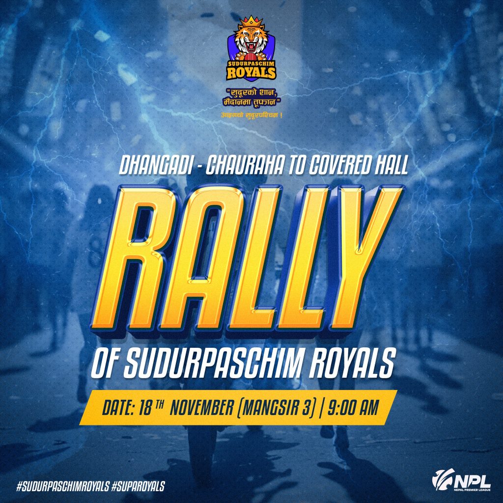 सुदूरपश्चिम रोयल्सले भोलि धनगढीको चौराहदेखि रङ्गशालासम्म र्याली आयोजना गर्ने भएको हो । र्यालीमा मार्की खेलाडी दीपेन्द्रसिंह ऐरी, आरिफ शेख, विनोद भण्डारीलगायत सहभागी हुनेछन् ।