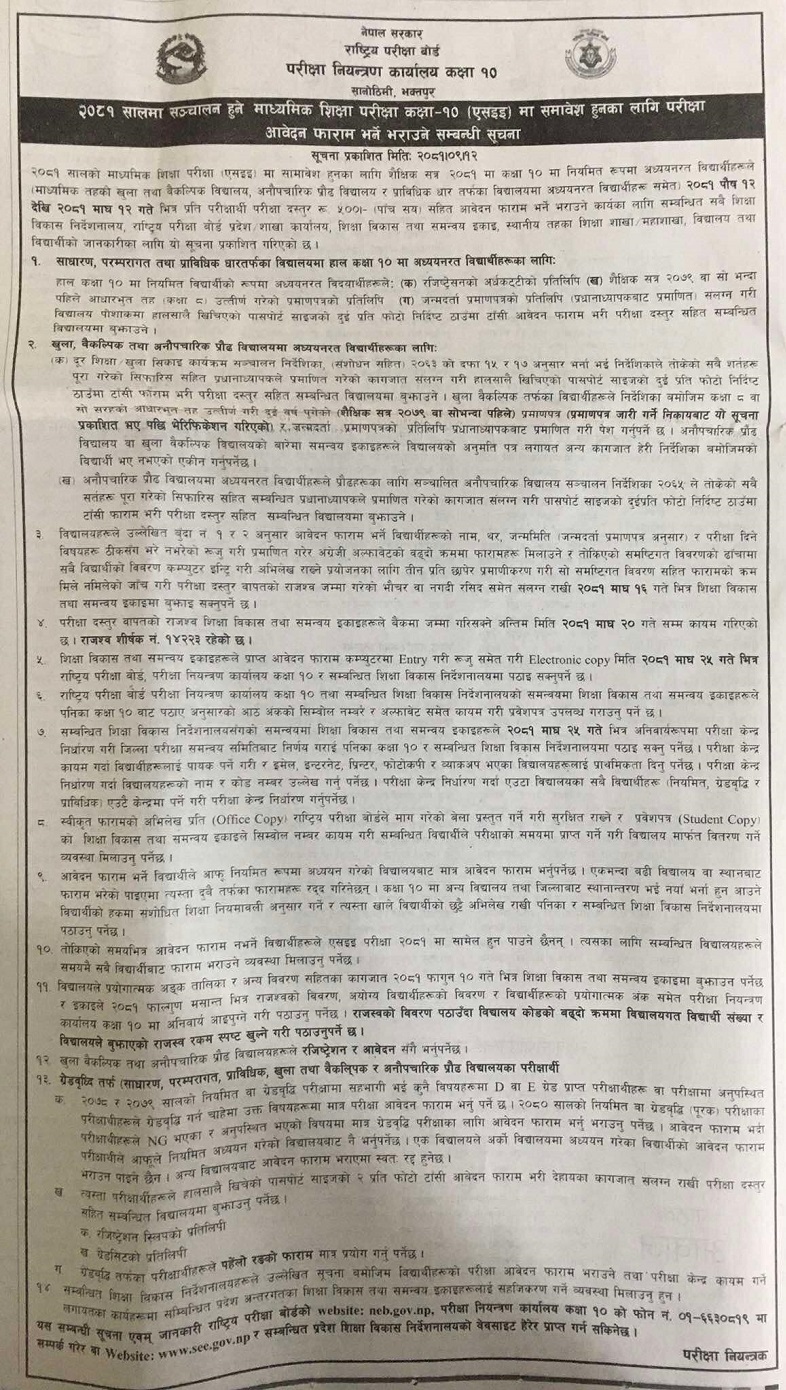 काठमाण्डौ । माध्यमिक शिक्षा परीक्षा (एसईई) को परीक्षा आवेदन फारम खुला भएको छ । परीक्षा नियन्त्रण कार्यालयले सूचना निकालेर आजदेखि माघ १२ गते भित्र परीक्षा दस्तुर पाँच सय रुपैयाँसहित आवेदन फाराम भर्न आग्रह गरेको छ ।