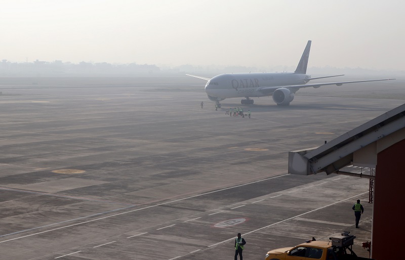 कतारबाट दिउँसो चाँडै आएको विमान हुस्सुका कारण अवतरण गर्न नसकेपछि कोलाकाता डाइभर्ट भएर पछि फेरि आएको हो । चितवन राष्ट्रिय निकुञ्जले दुवै हात्तीलाई बिदाइ गरेर हिजै भैरहवा पुर्याएको थियो ।