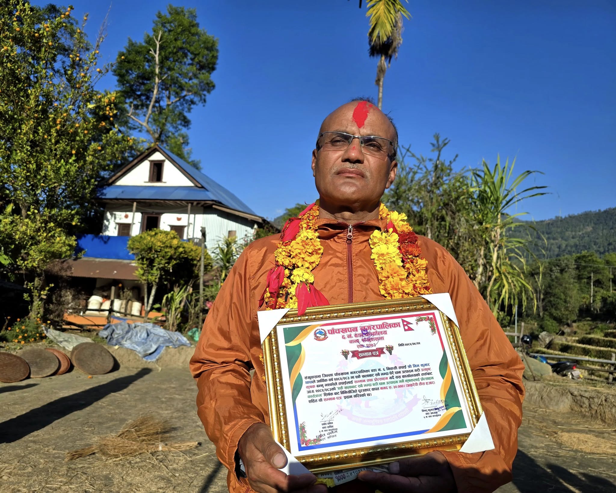 संखुवासभाको पाँचखपन नगरपालिका वडा नं. ६ का कृषक भिम कुमार थापा सम्मानित भएका छन् । एकै खलामा धेरै धान उत्पादन गरेको भन्दै कृषक थापालाई वडा कार्यालयले नगद ३० हजार रुपैंया र सम्मान पत्रसहित बुधबार सम्मान गरिएको हो । कृषक थापाको खलामा नै पुगेर वडा अध्यक्ष विष्णु कुमार श्रेष्ठ, वडा सदस्यहरु र कर्मचारीहरुले सम्मान गरेका हुन् । थापाले एकै खलामा ६५ मुरी धान उत्पादन गरेका थिए । खेत बाँझो नराख्न गरिएको प्रयासले पुरस्कृत भएकोमा कृषक थापाले खुशी व्यक्त गरे ।