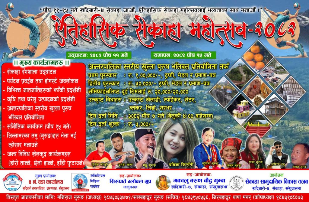 संखुवासभाको खाँदबारी नगरपालिका–४, सेकाहामा आज शुक्रबार देखि ऐतिहासिक सेकाहा महोत्सव सुसरु हुँदैछ । महोत्सवको अवसरमा अन्तरपालिका स्तरीय भलिबल प्रतियोगिता पनि सञ्चालन हुनेछ ।