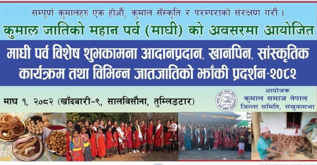 कुमाल समाज नेपाल जिल्ला समिति संखुवासभाले माघी पर्व विशेष कार्यक्रमका साथ मनाउने भएको छ । कुमाल जातीहरुको महान पर्व माघीको अवसरमा खाँदबारी नगरपालिका वडा नं. ९ तुम्लिङटार स्थित सालबिसौनामा विशेष कार्यक्रमको आयोजना गरिएको हो । सम्पूर्ण कुमालहरु एक होऔं, कुमाल संस्कृति र परम्पराको संरक्षण गरौं भन्ने मुल नाराका साथ माघी पर्व विशेष शुभकामना आदानप्रदान, खानपिन, सांस्कृतिक कार्यक्रम तथा विभिन्न जातजातिको झाँकी प्रदर्शनको आयोजना गरिएको आयोजकले जनाएको छ ।