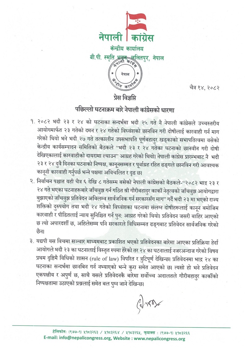नेपाली कांग्रेसले गएको भदौ २३ र २४ गते भएको नवयुवा आन्दोलनको घटनाबारे आफ्नो धारणा सार्वजनिक गर्दै निष्पक्ष छानबिन र दोषीमाथि कानुनी कारबाहीको माग गरेको छ । पार्टी केन्द्रीय कार्यालयले जारी गरेको प्रेस विज्ञप्तिमा नवयुवा आन्दोलन घटनाको सत्यतथ्य सार्वजनिक गर्न जोड दिइएको छ । साथै कांग्रेसले पार्टीका नेता रमेश लेखक पक्राउको विरोधमा सडक आन्दोलनमा नजाने बताएको छ ।