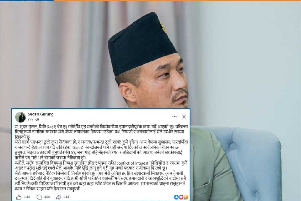 काठमाडौं । गृहमन्त्री सुधन गुरुङले पदबाट राजीनामा दिएका छन् । विवादित व्यवसायीसँग विभिन्न सेयर कारोबारमा मुछिएको आरोप लागेका गुरुङले प्रधानमन्त्री बालेन्द्र शाह (बालेन) लाई राजीनामा बुझाएका हुन् । उनले आफ्नो राजीनामाबारे सामाजिक सञ्जालबाट जानकारी गराएका छन् ।